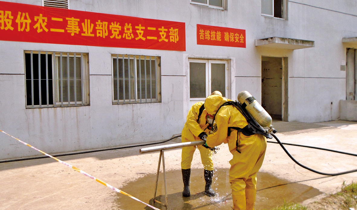 6月6日下午农一事业部双甘膦分厂组织氨回收送农二事业部液氨管道泄漏预案演练,事业部总经理孟长春担任演练总指挥。6月19日,I草丙班与双甘膦丙班联合进行了液氨槽装卸管道泄漏演练。演练前值长按照以往演练出现问题对原预案进行了修改,并且进行了泡沫消防炮、防化服穿戴专项训练。