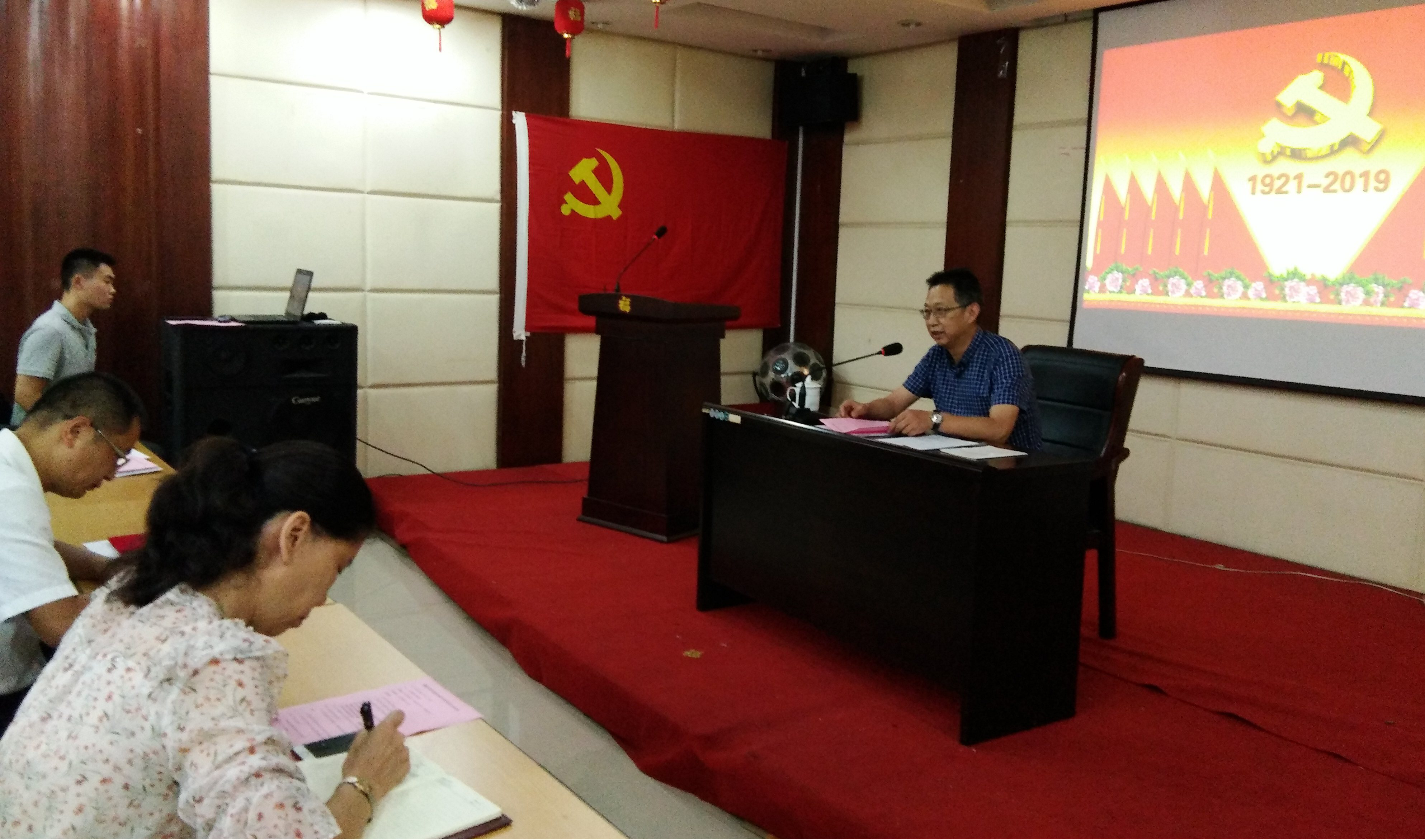 南通国融资产运营有限公司庆祝建党98周年暨7月份主题党日活动于7月18日在公司多功能厅召开。国融资产在职党员、离退休党员代表、入党积极分子参会。 大会在庄严的《国歌》声中开始,国融资产党委书记刘海兵代表公司党委作了《党委工作报告》,报告总结和回顾了公司党委2018年以来落实全面从严治党和履行“两个责任”等方面取得的成果、工作中存在的不足并展望了下一步的工作打算。报告希望公司全体党员干部不断增强“四个意识”,坚定“四个自信”,做到“两个维护”,将全面从严治党工作渗透到各项工作中,与公司中心工作、业务工作紧密结合,推动公司全面从严治党工作走向深入。