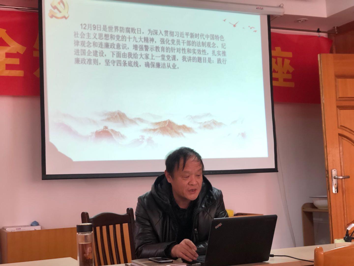 本次活动由党支部书记刘志清主持会议,活动包括三项议程,首先由党支部书记刘志清给全体党员上党课,课程重温了《廉政准则》,警醒全体党员树立正确的人生观、价值观、世界观,防微杜渐。提出了坚守四条底线,警示党员干部坚决不做违法的事,一定不做违纪的事,拒绝去做诱惑的事,认真去做尽责的事。然后,通过观看警示教育片,让党员干部吸取教训,引以为戒。最后,召开专题组织生活会,围绕警示教育专题进行了批评与自我批评。