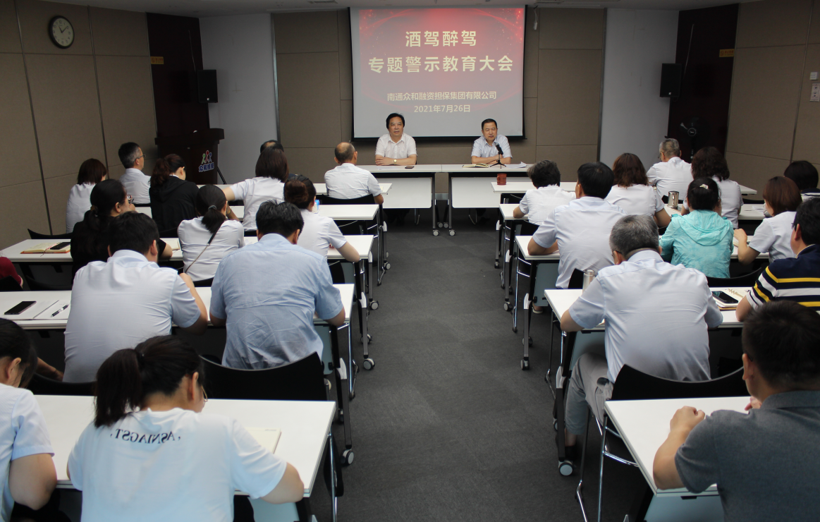 为深入贯彻落实产控集团关于开展“酒驾醉驾专题警示教育”通知要求,进一步强化酒后驾车警示教育,有效预防和坚决遏制公司干部职工酒驾醉驾等违法违纪行为的发生,7月26日上午,南通众和融资担保集团有限公司召开酒驾醉驾专题警示教育大会,本部全体干部职工、子公司中层以上干部近60人参加会议,党支部书记何叶主持会议。